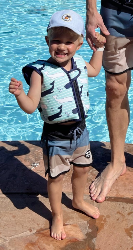 One of the best things about this swim vest is that its lightweight and lays flat, so it’s packable! We brought it with us on vacation to Hawaii recently, and our toddler wore it every day! I was so thankful we packed it with us in our suitcase!