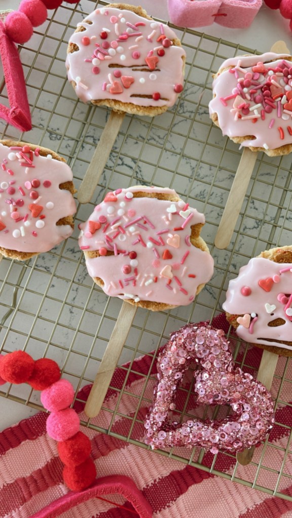 Take some craft sticks and make these easy peasy cake mix cookies into LOLLIPOPS!! GENIUS! You will definitely the prized mama at the Valentine’s Day school party with these showstoppers! For a great gift idea, it’s so fun to individually wrap them in plastic and add a pink or red bow!