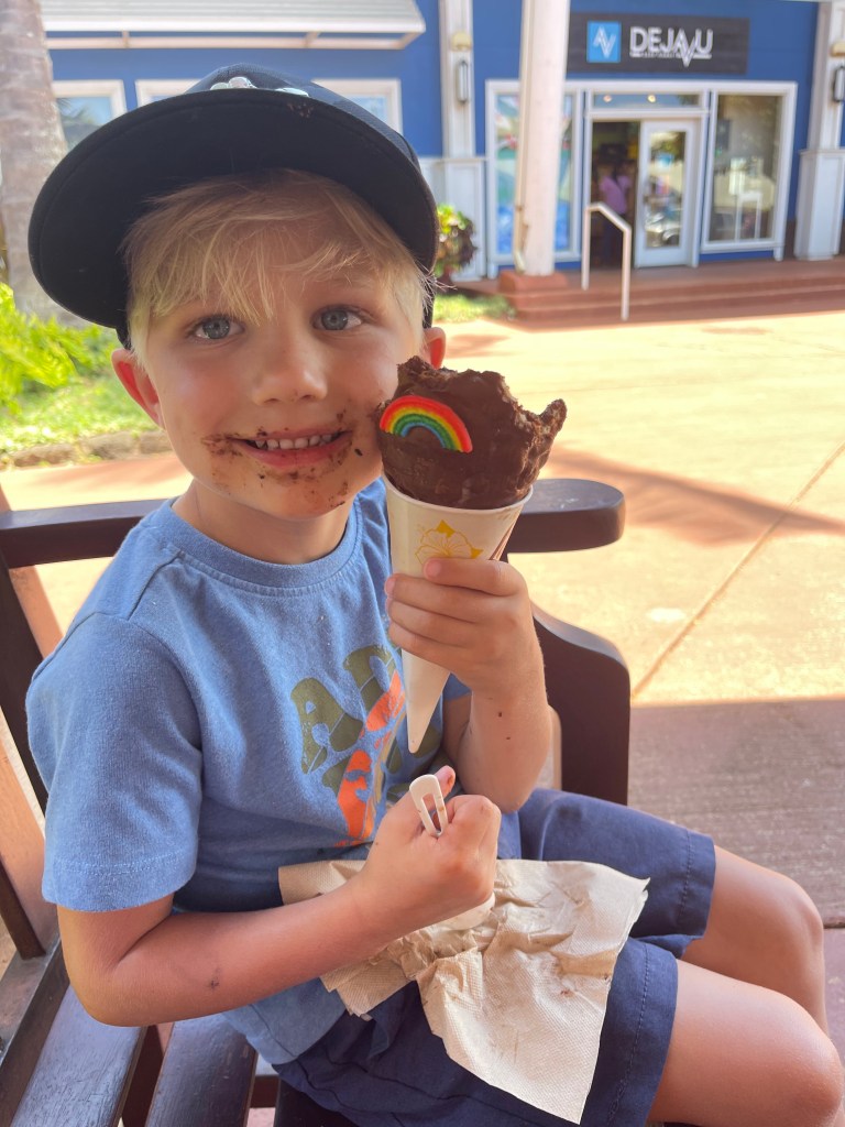 The last two days were so jam-packed with excursions and activities around the island that we decided to take it easy at our resort. My husband went surfing while the kids jumped over waves in the morning, then we spent the afternoon by the pool. For dinner, we popped over to Duke’s Kauai (located on property). Afterwards, we walked to a little ice cream shop in Lihue, then sat on the beach watching the sunset while eating our frozen treats.