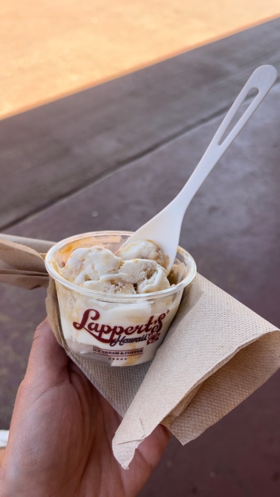It was starting to get close to lunchtime, so we headed over to Poipu Shopping Village to walk around, shop and grab a bite. We hadn’t purchased any souvenirs during the week, so we grabbed a couple of fun t-shirts for the kids at Crazy Shirts. I love that the shirts are dyed with natural substances, like crater dust, cinnamon and apricot. We lunched at Bubba Burger, which has the best hamburgers on Kauai! We also treated ourselves to onion rings and truffle fries! The treats continued with ice cream at Lappert’s, which is the best local ice cream in Hawaii and made in Kauai! I wanted a flavor that felt Hawaiian, so I got the Caramel Coconut Macadamia Nut, and it was creamy and delicious!