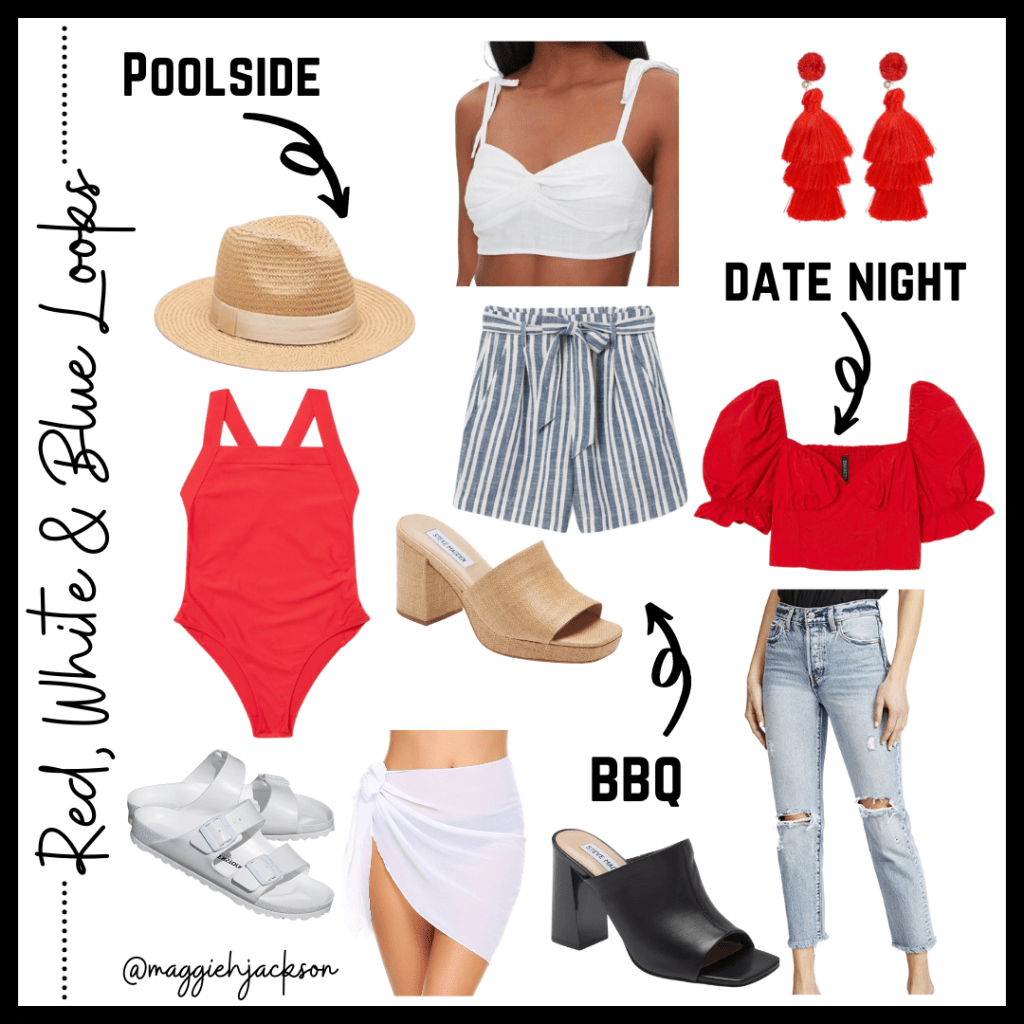 I absolutely love summer! The Fourth of July is one of my favorite holidays, but I like to kick off the season of red, white and blue outfits with Memorial Day Weekend! I don’t know about you, but since its the first long holiday weekend in the COVID vaccination era, I’m ready to celebrate with family and friends! I can’t wait to get dressed up and see people again! Here are some easy red, white and blue looks to copy for poolside parties, backyard BBQs and date nights this summer!