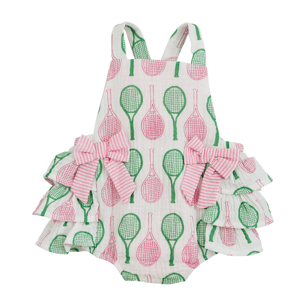 I’m a big tennis fan, and my daughter adores being like mommy, so we’re both loving this adorable tennis print that comes in a dress for toddlers, as well as a baby longall, sunsuit and sleeper. Check out all the cute tennis outfits from Mud Pie, below!