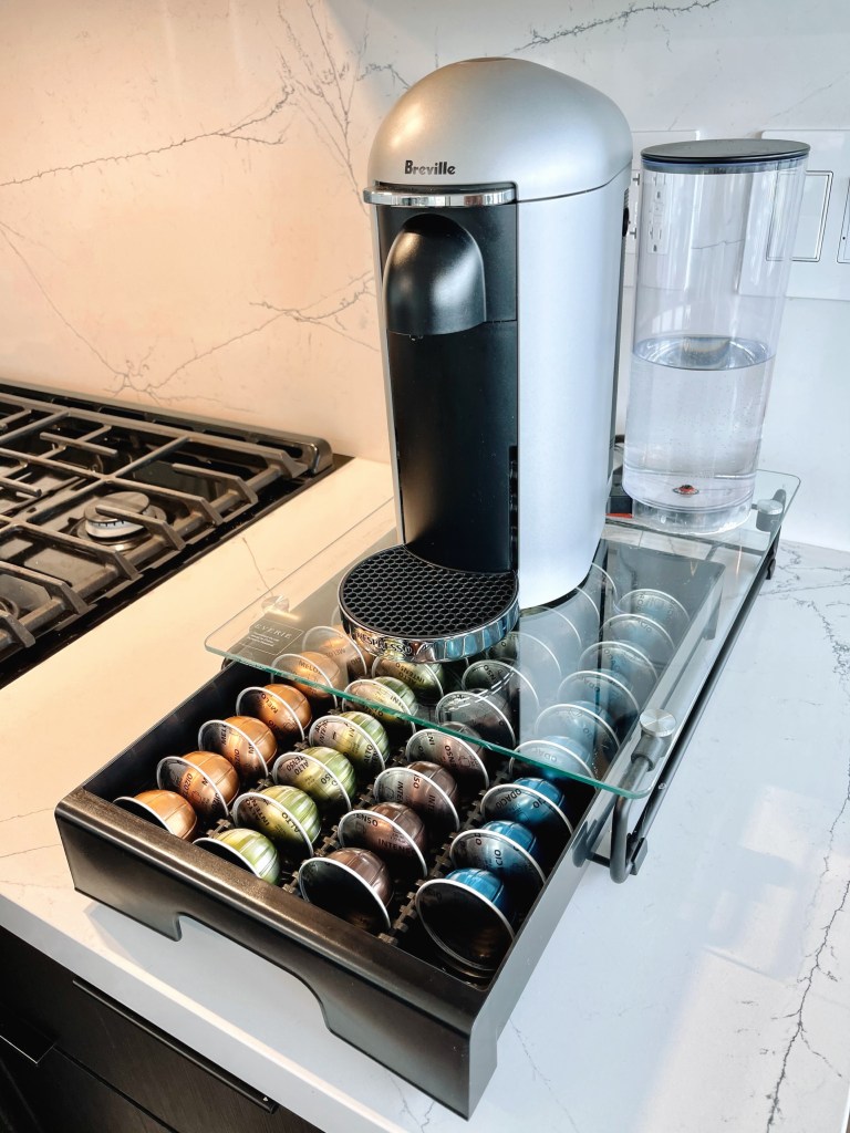 We had a Nespresso machine for three years before I found the perfect glass top organizer drawer holder on Amazon. We used to throw our pods in a drawer, and even with drawer organizers, they never felt truly organized and they took up precious drawer space! This glass top organizer is perfect to go under the machine, and beautifully organizes all of our pods. I love that it fits with our modern, minimalist kitchen design.