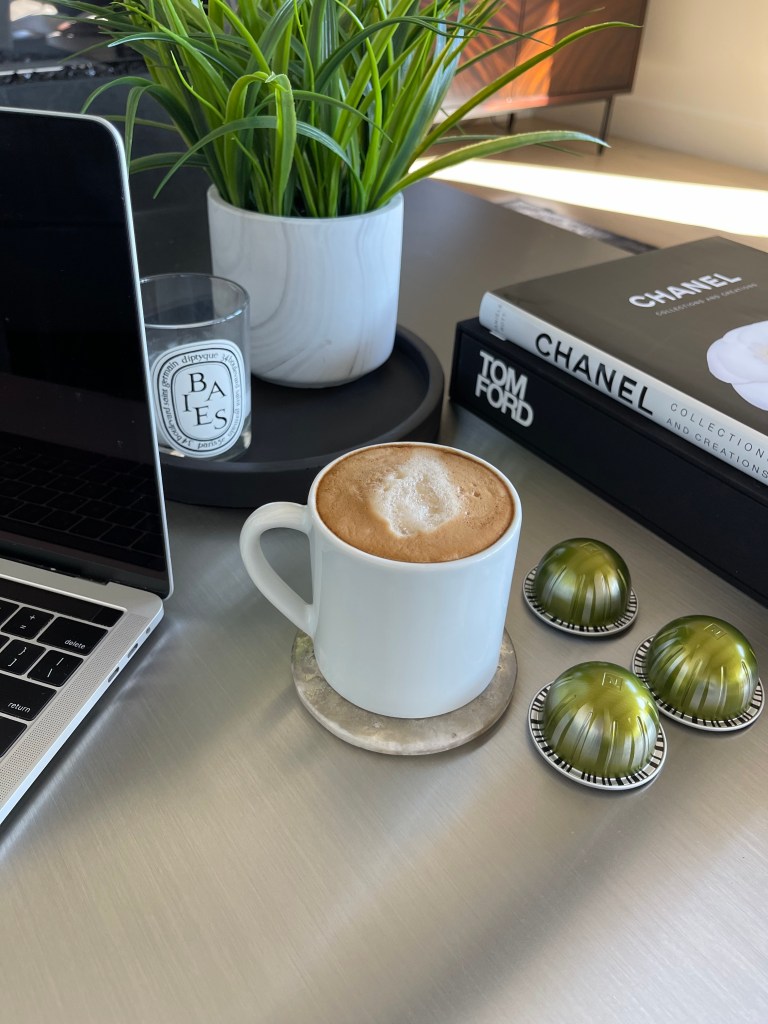 A few of my favorite things: A cup of Nespresso coffee, Intenso XL coffee pods, Diptyque candle, Chanel and Tom Ford coffee table books